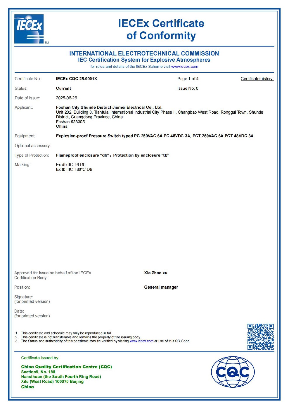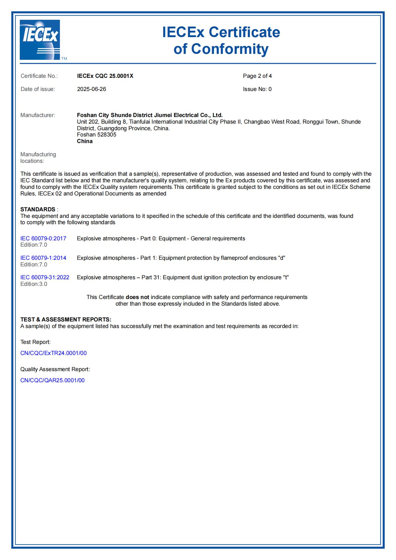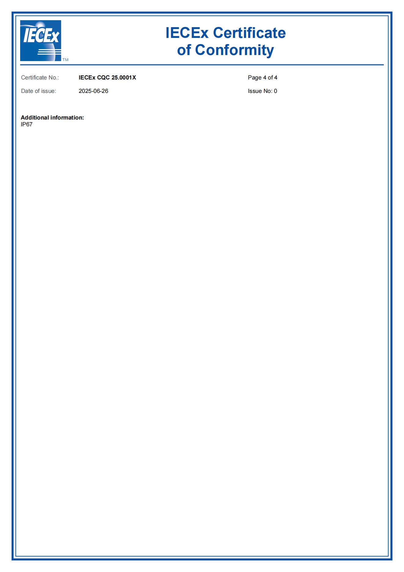 我司已順利通過(guò)國(guó)際電工委員會(huì)(IEC)防爆電氣產(chǎn)品認(rèn)證體系(IECEx)審核,于2025年6月26日獲得IECEx證書,此舉標(biāo)志著我司產(chǎn)品在安全性、質(zhì)量及可靠性方面達(dá)到國(guó)際標(biāo)準(zhǔn),為拓展全球市場(chǎng)奠定堅(jiān)實(shí)基礎(chǔ)。